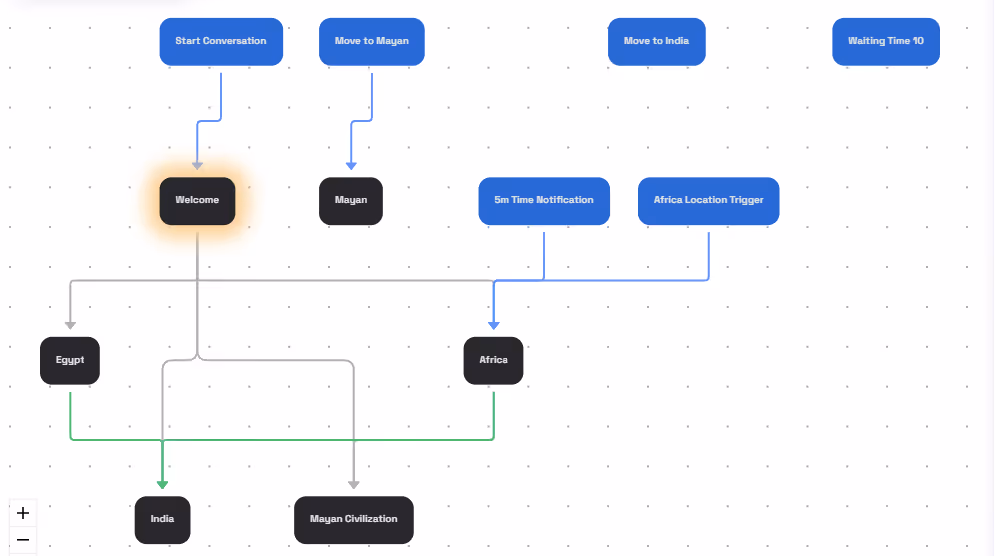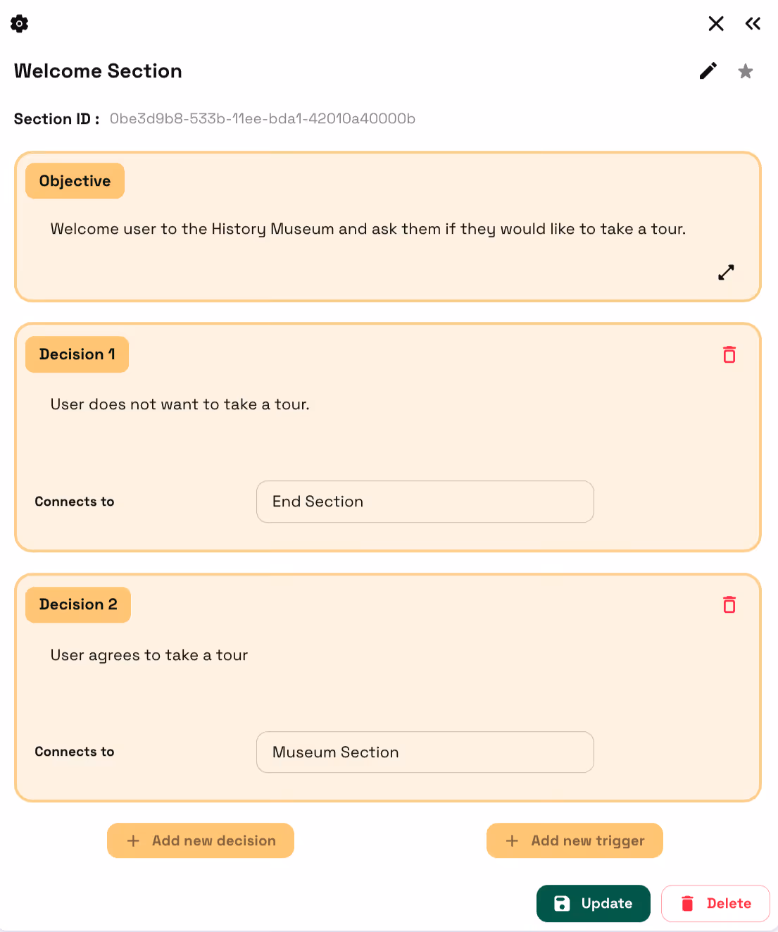 A Narrative Graph is structured around three fundamental elements: Sections (black node), Triggers (blue node) and Decisions (edges). In the above Museum Tour Guide graph we have three sections (Welcome Section, Museum Section and End Section), three decisions (shown by the edges) and a trigger (Initiation Trigger). The above simple graph is designed for the Museum Tour Guide Use case.