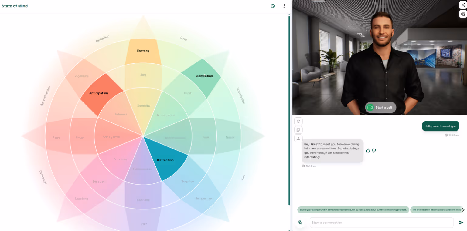 Can I control which emotions appear? You guide emotions through personality traits, speaking style, objectives, and conversation context. The wheel reflects the current result of those inputs.