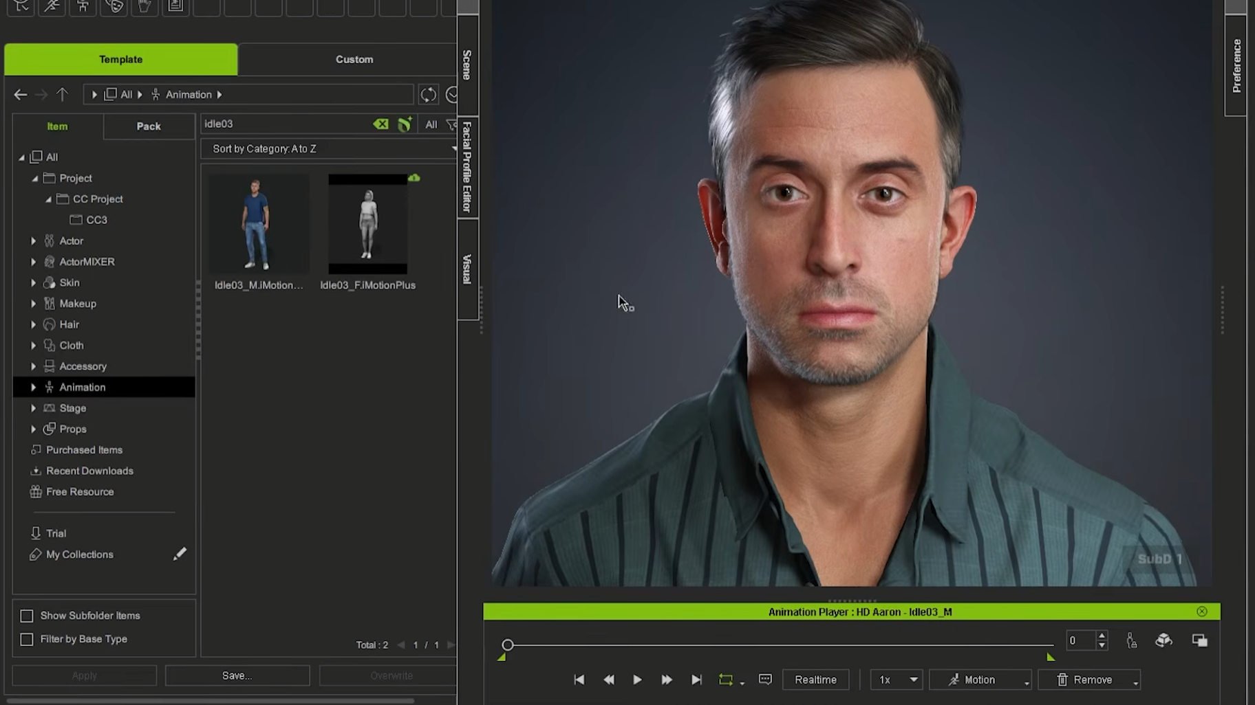 2. Navigate to the Animation tab and apply an Idle animation (e.g., idle03).