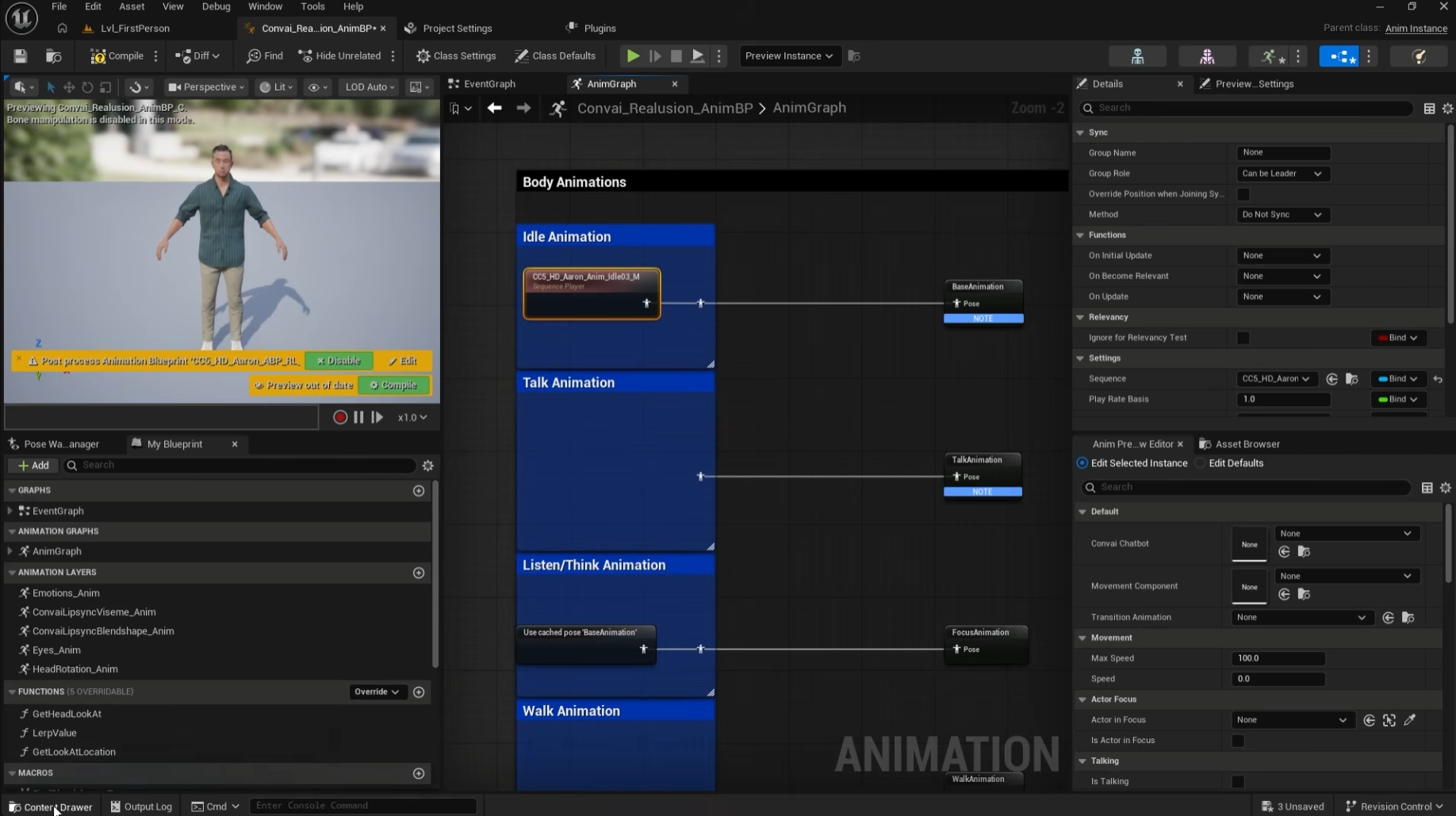 3. Open the Animation Blueprint, assign your Reallusion Skeleton, and hook up the Idle and Talking animations you imported earlier within the Animation Graph. Ensure the animations are set to loop!