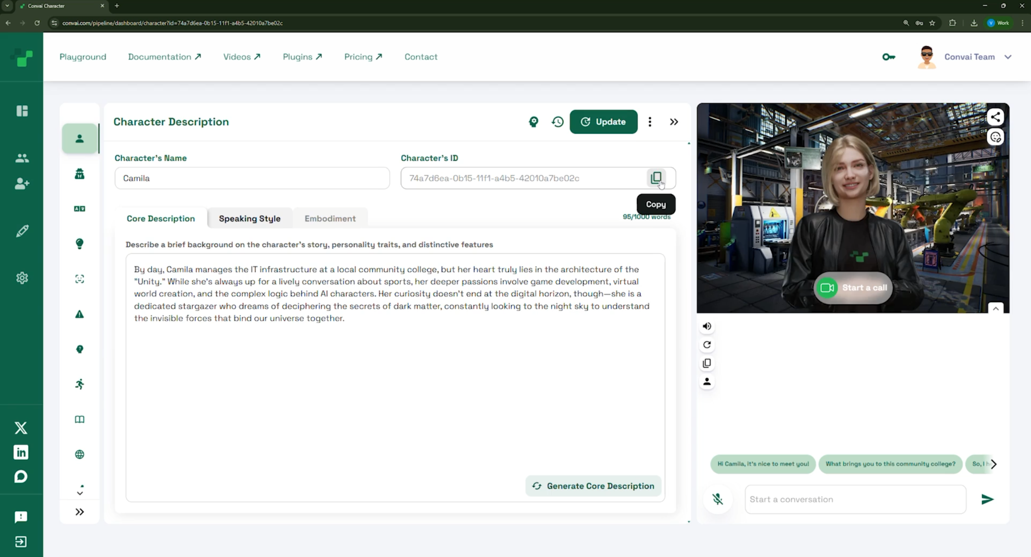 4. Copy your Character ID from the Convai Dashboard (e.g., for a character like Camilla) and paste it into the ID field.