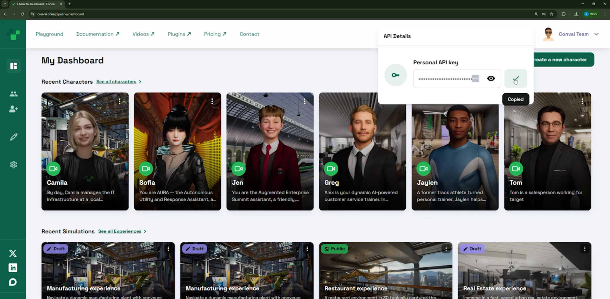 2. Head over to the Convai Dashboard, copy your API Key, and paste it into the Unity Account window.